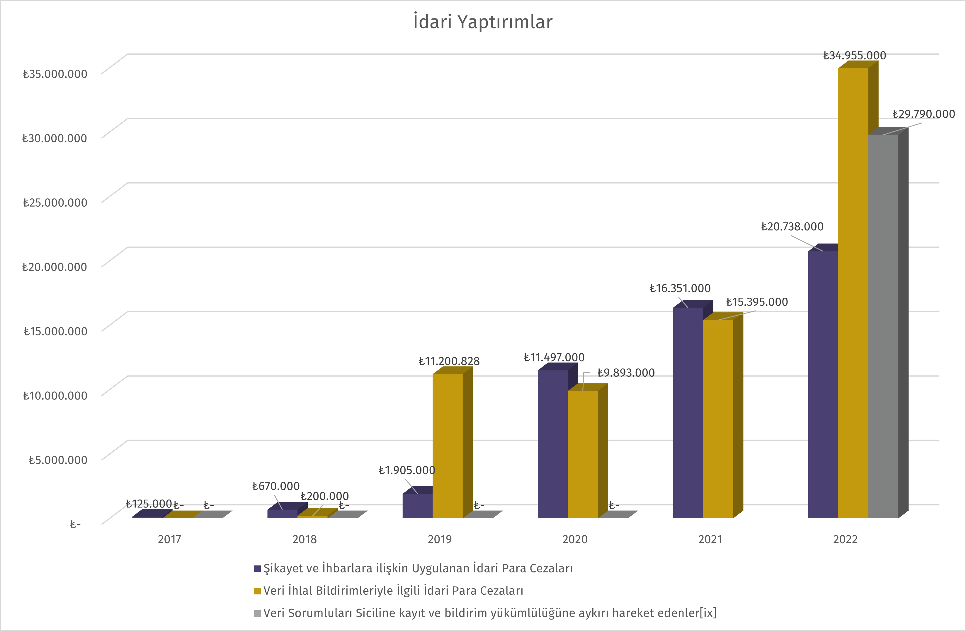 [ix] VERBİS’e kayıt ve bildirim yükümlülüğü için son tarih olarak 31 Aralık 2021 belirlenmiş olup; Kurum’un 21 Nisan 2022 tarihli duyurusu ile VERBİS’e kayıt ve bildirim yükümlülüğüne aykırılık sebebi ile idari yaptırım uygulanacağı ifade edilmiştir. Bu sebeple, 2017-2021 döneminde uygulanan idari para cezası bulunmamaktadır.